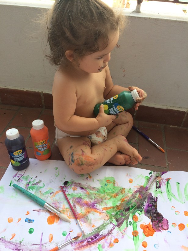 Descubrimos que le encanta «pintar» y también descubrimos que le gusta verlo a uno pintar y que le expliquemos que estamos dibujando. Le gustan las pinturas y los marcadores, los crayones no son de sus favoritos pero igual los usa. Ama ensuciarse y pintarse ella misma y a los demás, se ríe a carcajadas a cada rato y esa risa es música para mis oídos. Nunca se me hubiera ocurrido que ella disfrutaría pintar tanto como lo hace, e incluso me he dado cuenta que hasta tararea canciones cuando esta concentrada pintado. Tanta emoción le da que hasta me contagió a mi también y ahora pintamos las dos juntas, tiradas en el piso de nuestra sala, riendo y pasando nuestras tardes.