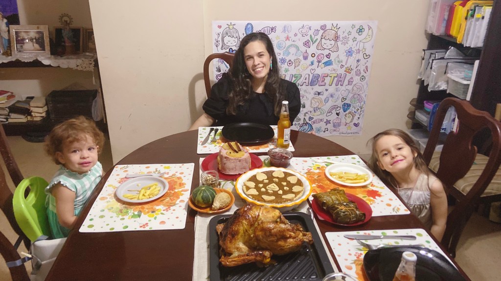 Arturo le explicó a #AnaTerremoto porque nosotros celebramos Thanksgiving y antes de cenar hicimos una oración dando gracias y luego cada uno dijo que es lo que mas agradecen de este año (#HuracanAbigail dice que la comida, por si no se lo imaginaban)